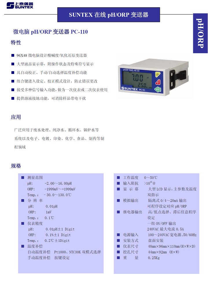 首页 >> 产品中心 >> PH,ORP,离子浓度仪表 >> PH/ORP变送器PC-110