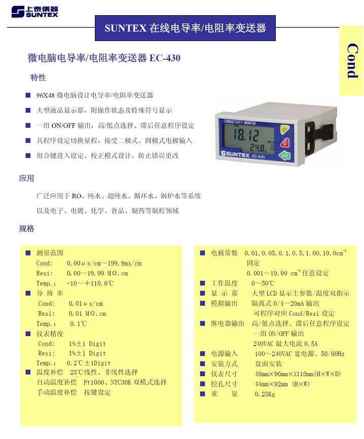 首页 >> 产品中心 >> 电导率,电阻率,酸碱盐浓度仪表 >> 电导率/电阻率EC-430