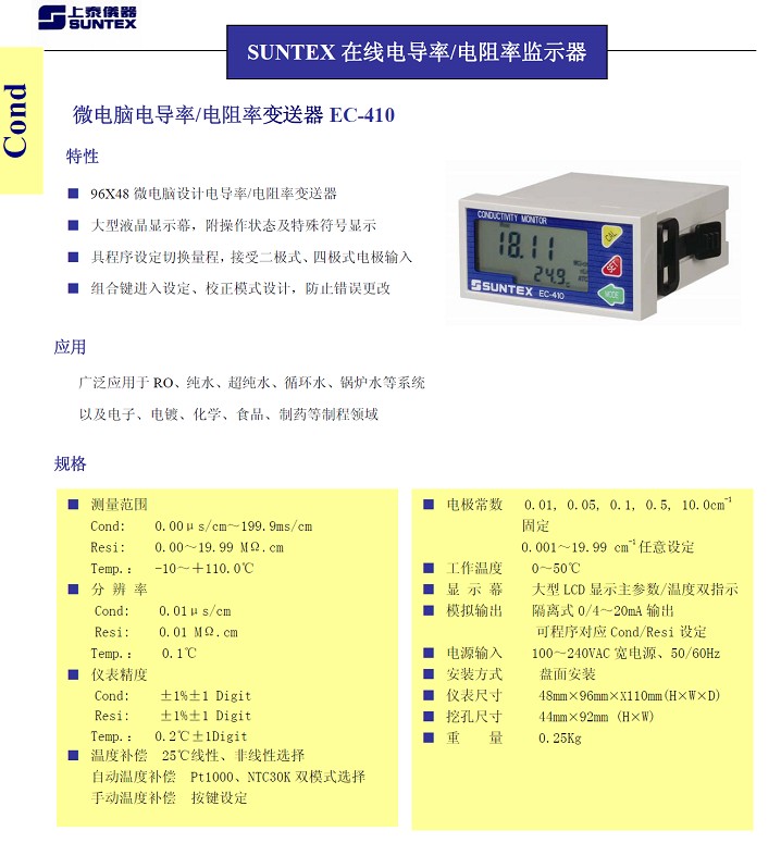 首页 >> 产品中心 >> 电导率,电阻率,酸碱盐浓度仪表 >> 电导率/电阻率EC-410
